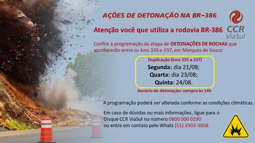A CCR ViaSul informa nesta sexta-feira (18) a programação de detonações para a próxima semana, na BR-386. Conforme o cronograma, as ações devem acontecer na segunda, quarta e quinta-feira (21, 23 e 24/08), entre os kms 335 e 337 em Marques de Souza, às 14h. A rodovia deverá ser totalmente bloqueada por até, no máximo, […]